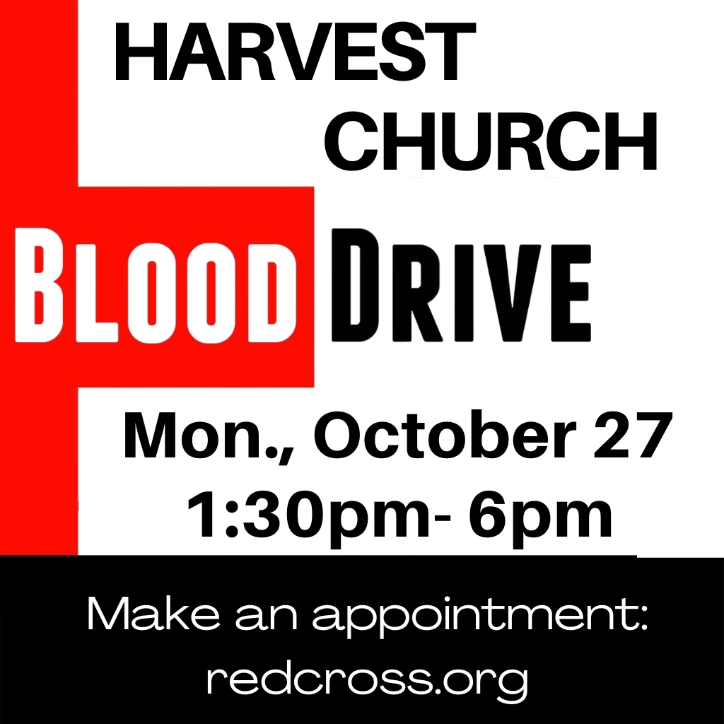 Blood Drive Red Cross Blood Drive Monday, October 27 1:30-6:00pm Please sign up online by going to www.redcross.org. + Add to Google Calendar + iCal / Outlook export Date Oct 27 2025 Expired! Time 1:30 pm - 6:00 pm Location Harvest Church Washington, NC Share this event