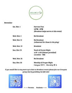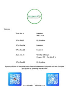 BREAKOUT is for students in Grades 6-12 and meets on Wednesday Nights from 6:30 – 8:00 upstairs in the BIG ROOM.