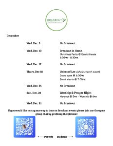 BREAKOUT is for students in Grades 6-12 and meets on Wednesday Nights from 6:30 – 8:00 upstairs in the BIG ROOM.